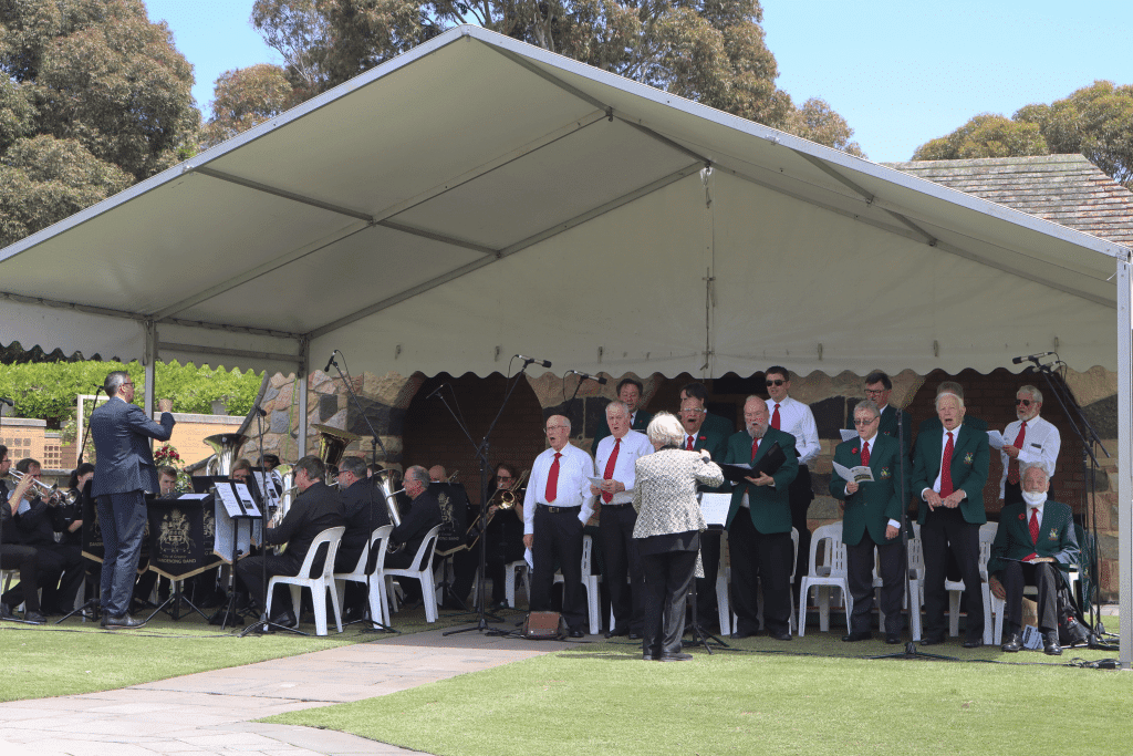 Springvale Botanical Cemetery, Sunday 5 November 2023The choir was pleased to return to Springvale Botanical Cemetery for the sixteenth time since 2004.The audience was again smaller than in the past. Some thought this might be because Melbourne Cup Day was only 2 days later, and some people were taking a long weekend.State President Dr Robert Webster OAM led proceedings, aided by Chaplain John Raike. Later in the service, Mr Robert Krog gave the main address.The City of Greater Dandenong Band provided the musical accompaniment and combined with Vic Welsh who led the singing in O God Our Help In Ages Past, Abide With Me and the National Anthem.Lest We Forget