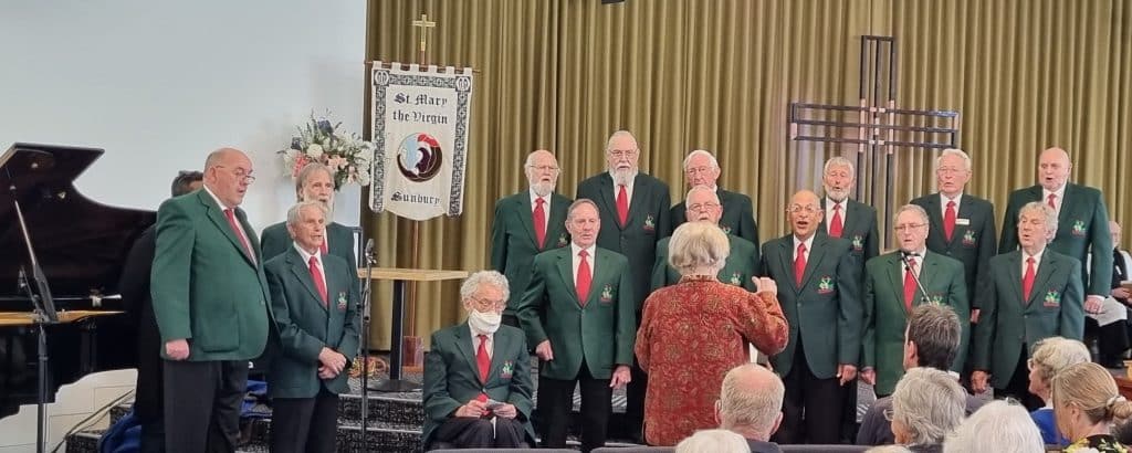 Three vicars officiated the service: the Rev. Matt Browne, the Rev. Canon Hugh Prentice, and Tom’s sister, the Rev. Lilian Morgan. There were three congregational hymns, and the Victoria Welsh Choir — of which Tom was a long-serving chorister and Chaplain — performed Morte Criste, Calon Lân, Myfanwy, and finally Sunset Poem as the coffin was carried out to the hearse.