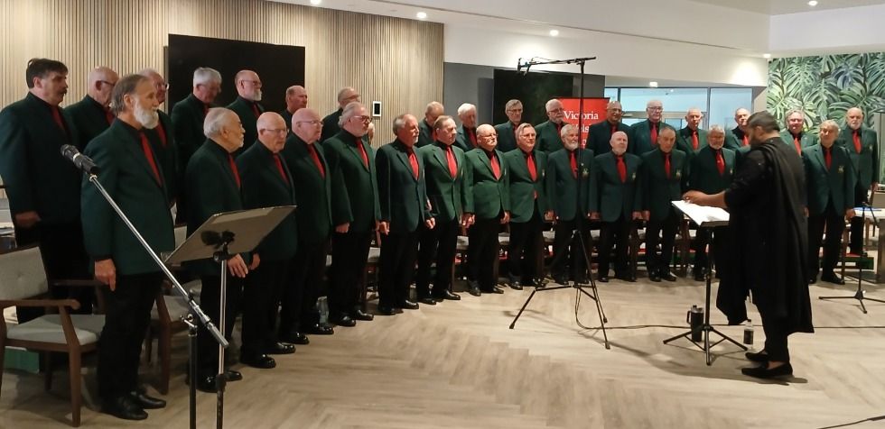 As choristers moved to surround the audience, Tony explained that the finale would be the Welsh national anthem (*Hen Wlad Fy* *Nhadau* – Land of my Fathers) sung together with *Waltzing Matilda* with more audience participation. Then all was hushed as choristers chanted the farewell *Sunset Poem* from Under Milk Wood with Tony mentioning that Dylan Thomas would have been very pleased to know that we were immortalising his words on what would have been his 110th birthday.